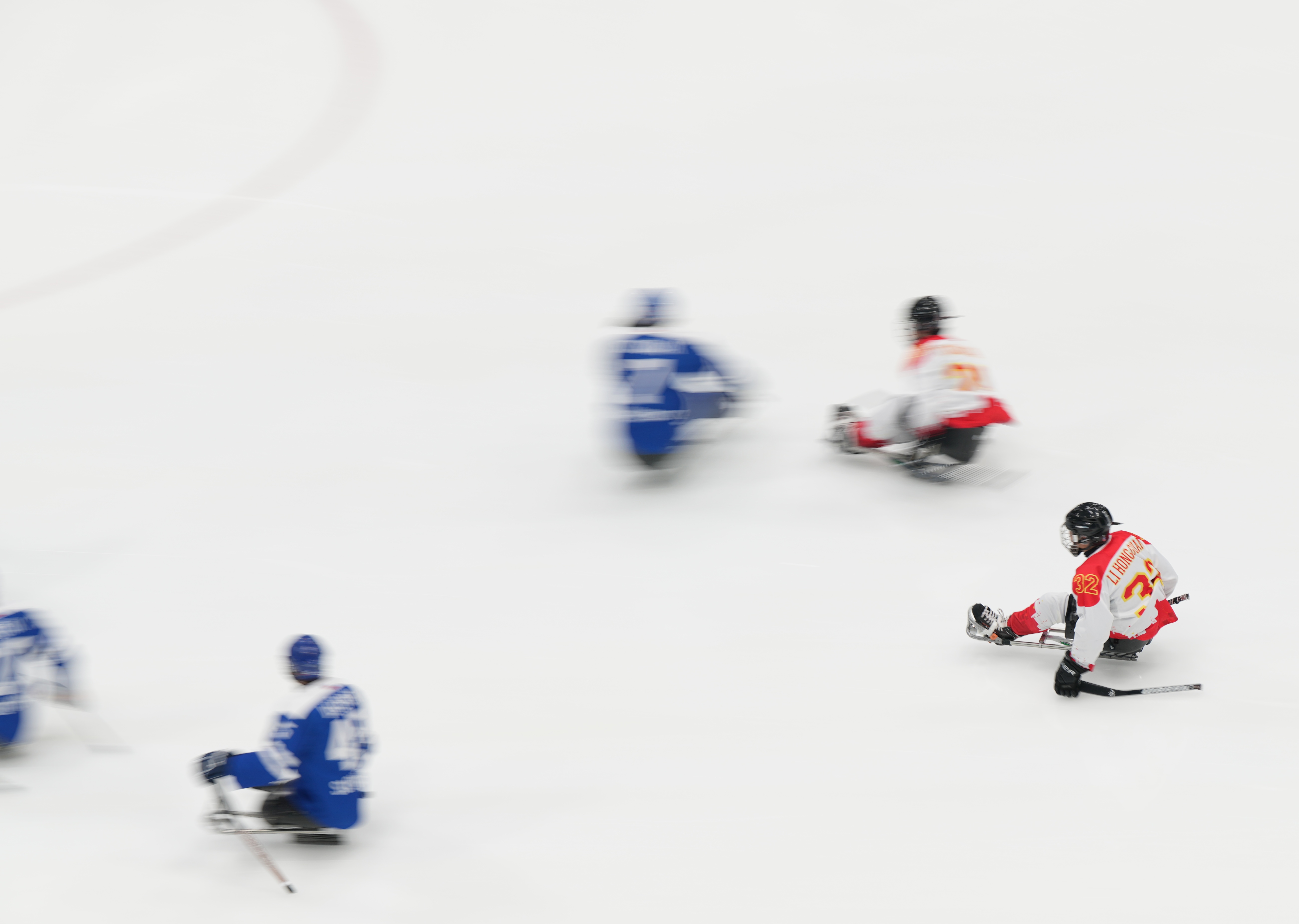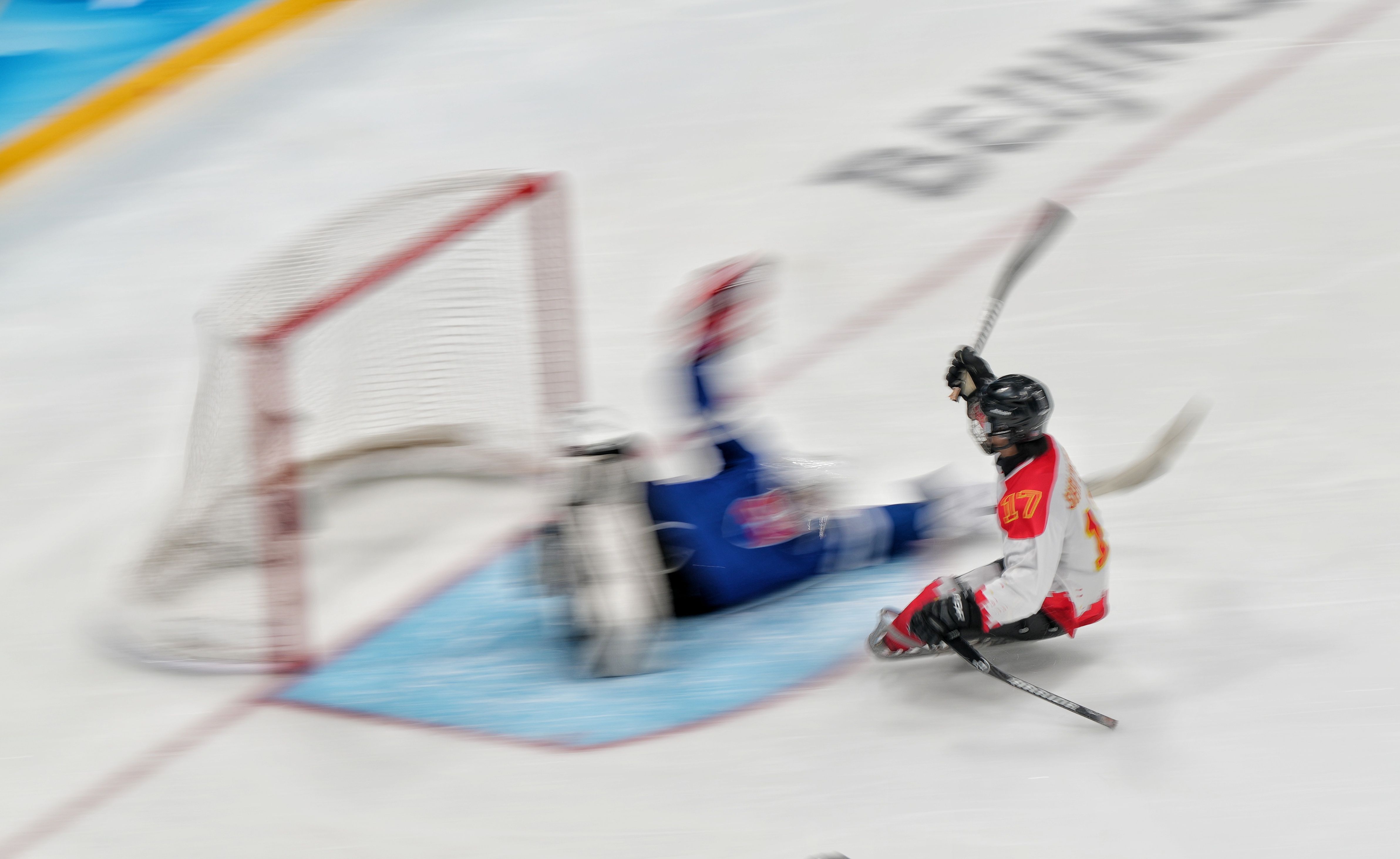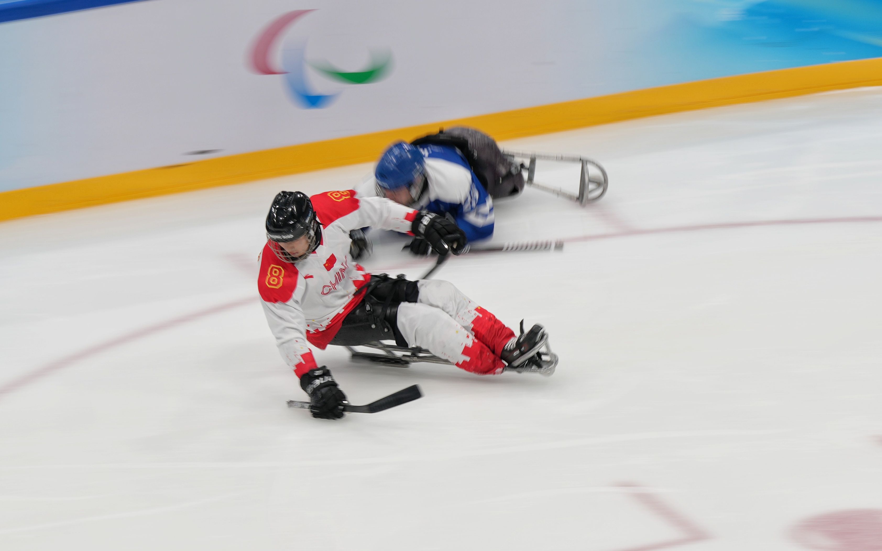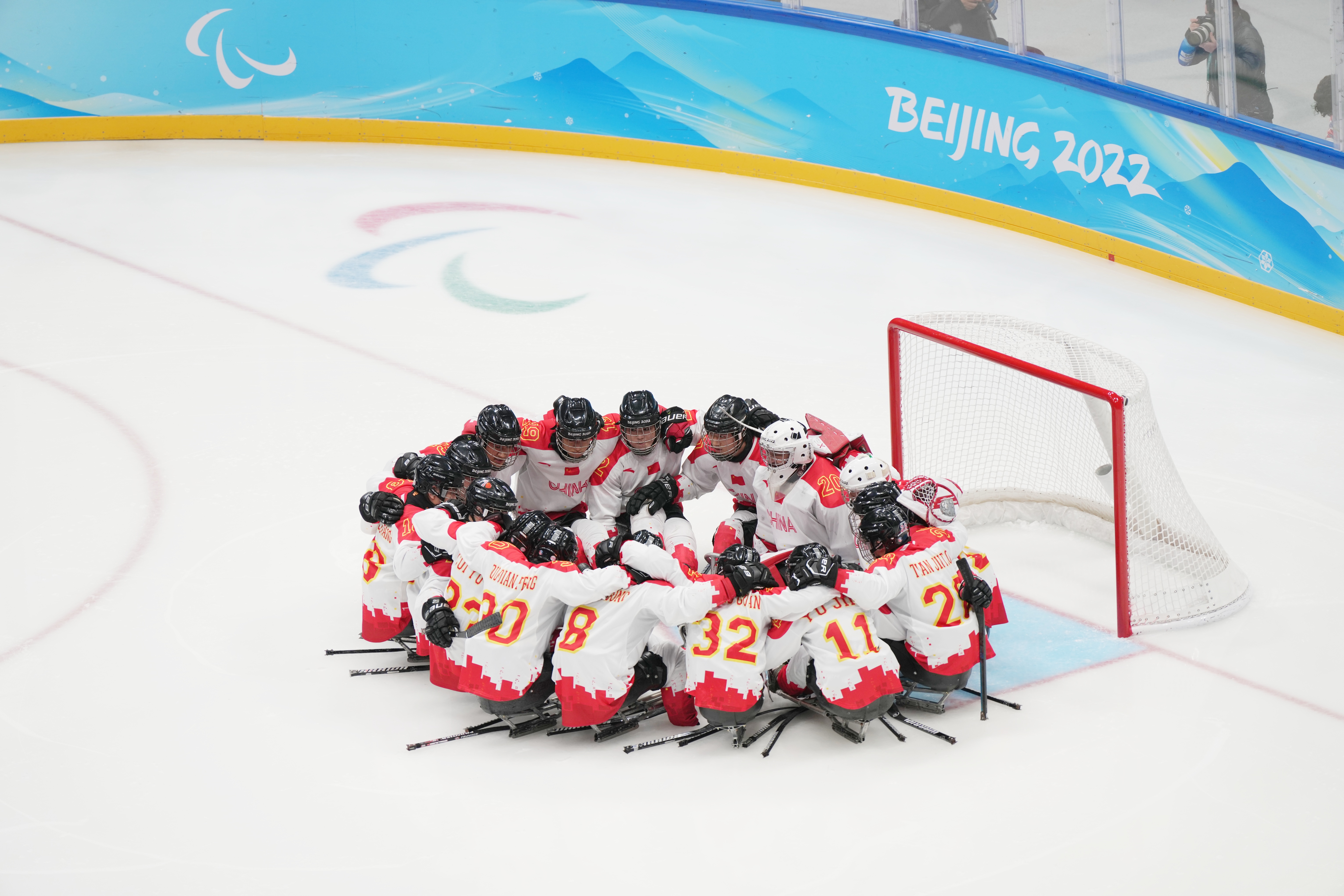 首局比赛8分22秒,中国队18号王聚江因抱人被罚时2分钟。就在中国队少打多的时候,17号球员申翼风快速反击中打进一球,这是中国残奥冰球队在冬残奥会上的首球。
