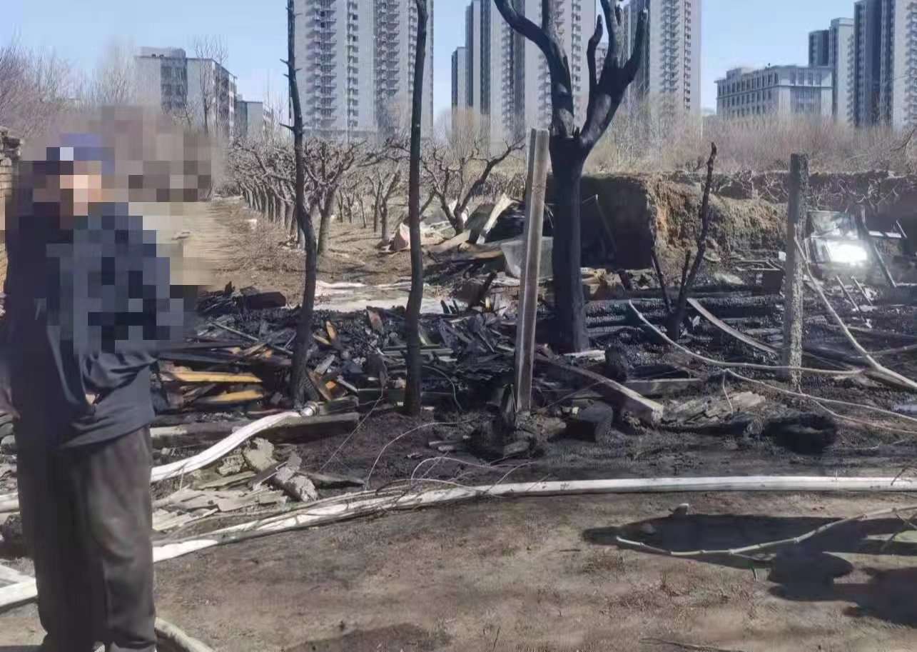 3月7日,通州区宋庄镇丁各庄村农田一凉棚和堆放的木头起火。通州消防供图