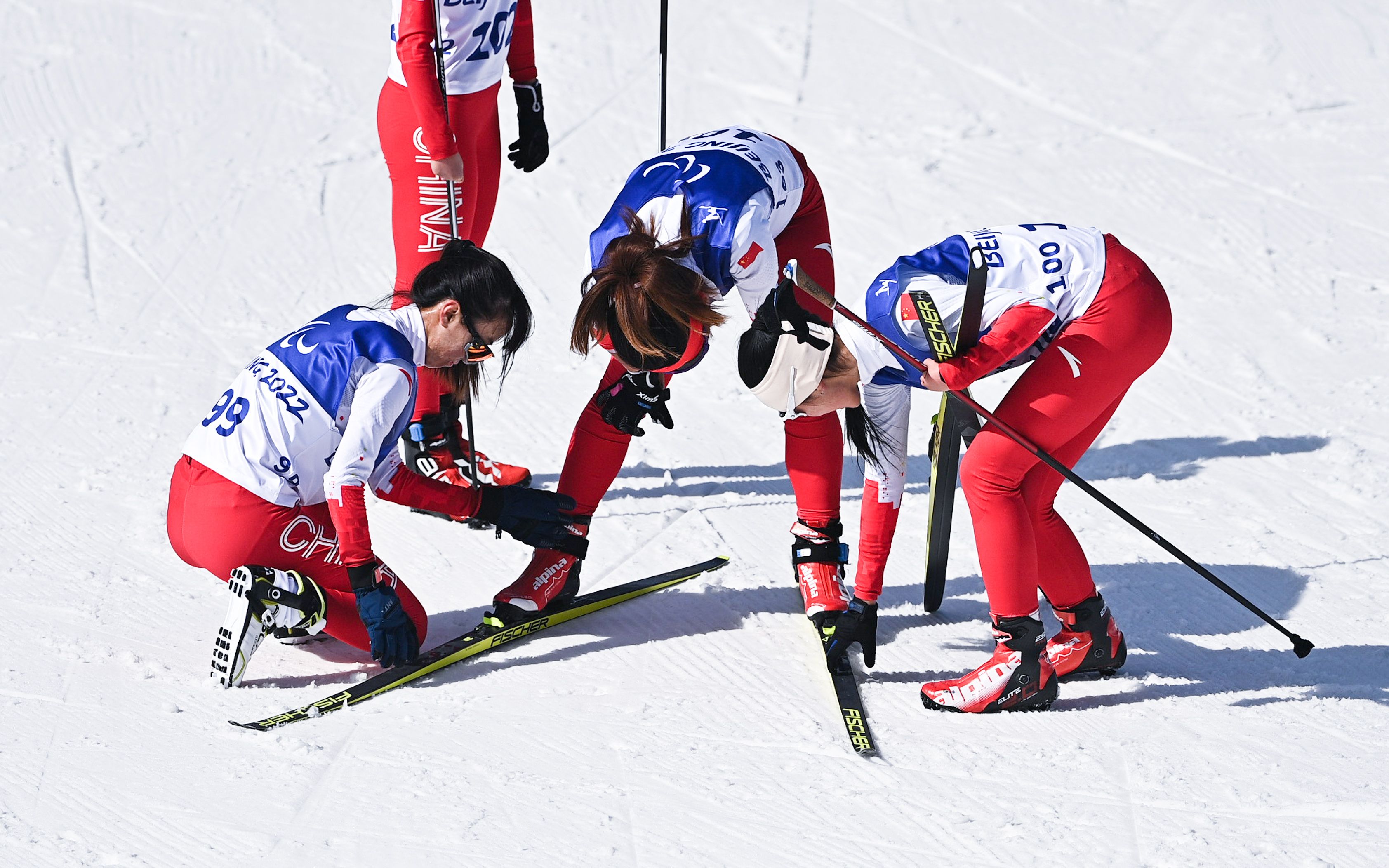 赵志清(左)和郭雨洁(右)帮助队友李慧玲脱雪板。图/新华社