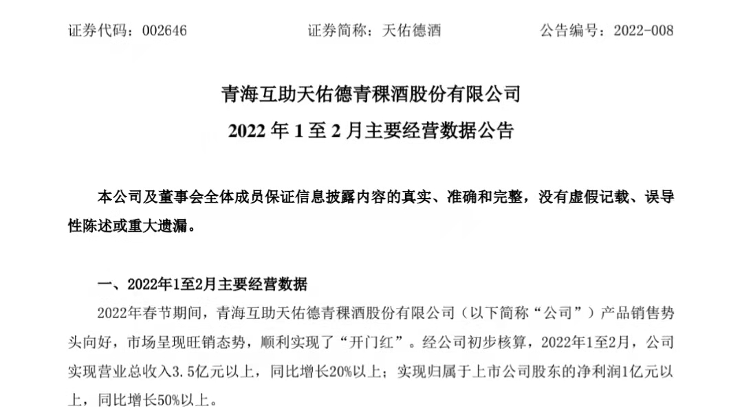 新京报讯(记者 王真真)3月10日,青海互助天佑德青稞酒股份有限公司(以下简称“天佑德酒”)发布公告称,2022年1-2月,预计实现营业总收入3.5亿元以上,同比增长20%以上;预计实现归属于上市公司股东的净利润1亿元以上,同比增长50%以上。