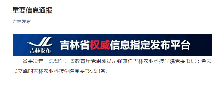 据吉林发布官微3月10日消息,吉林省委决定,总督学、省教育厅党组成员岳强兼任吉林农业科技学院党委书记;免去张立峰的吉林农业科技学院党委书记职务。