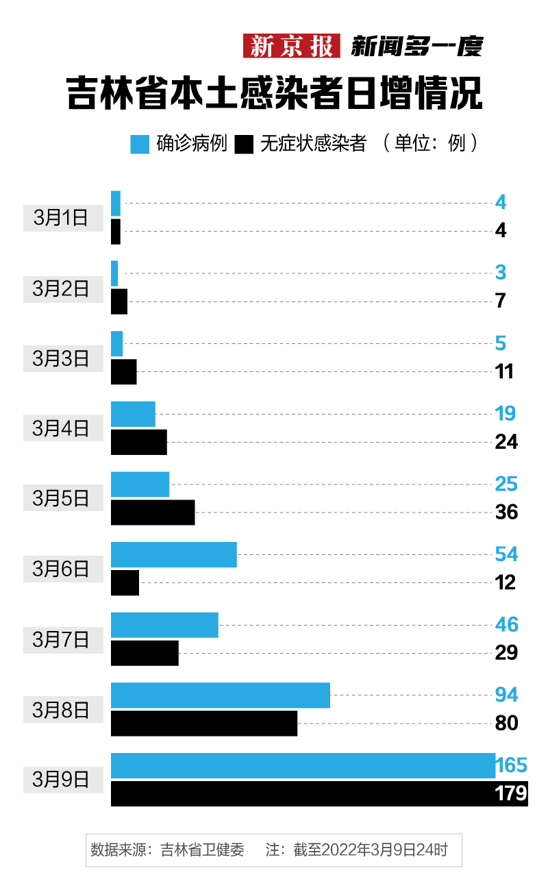 据吉林省卫健委网站消息,3月9日0-24时,全省新增本地确诊病例165例,本地无症状感染者179例,其中吉林市单日新增283例本土感染者。自3月1日以来,截至3月9日24时,吉林省本轮本土新冠疫情感染者接近八百人,期间无症状感染者数量多日超过了确诊病例数。