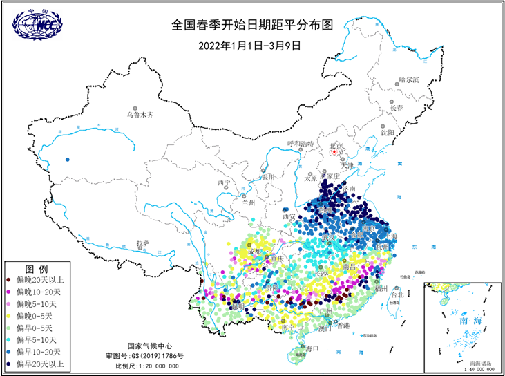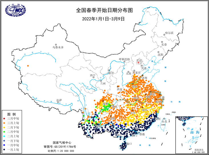 截至3月9日,黄淮地区西部、江淮以南大部及贵州、重庆南部、四川东部、云南北部等地已经入春(华南大部及云南南部属于无冬区)。其中云南北部、四川东南部部分地区于2月中旬入春;江南南部及东部、华中部分地区于2月下旬入春;江淮、黄淮西部及四川东北部、贵州等地于3月上旬入春。