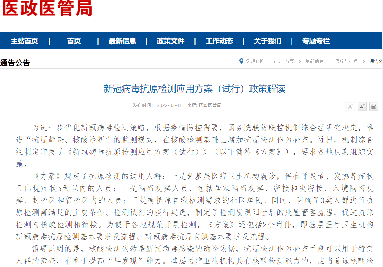 ▲3月11日,国家卫健委医政医管局公布《关于印发新冠病毒抗原检测应用方案(试行)的通知》及《新冠病毒抗原检测应用方案(试行)政策解读》。图/国家卫生健康委官网截图