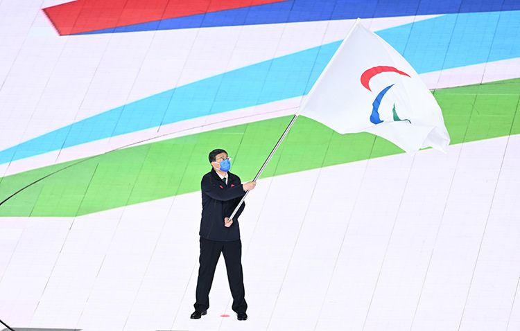 会旗交接仪式:北京市市长陈吉宁挥舞国际残奥委会会旗。