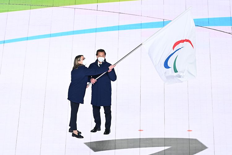 会旗交接仪式:米兰市副市长、科尔蒂纳丹佩佐市市长共同挥舞国际残奥委会会旗。