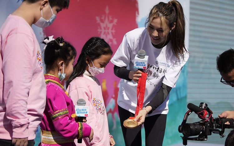 谷爱凌拿出金牌与小朋友们分享滑雪心得。首钢大跳台恰是谷爱凌在北京冬奥会斩获首金的赛场。