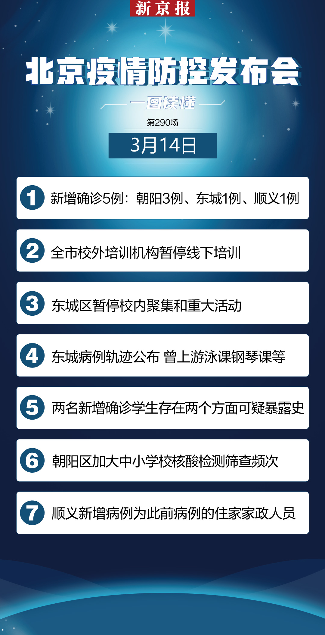 3月13日15时至14日16时,本市新增本土新冠肺炎病毒感染者5例,均为确诊病例,其中包括2名在校学生;朝阳区3例、东城区1例、顺义区1例。