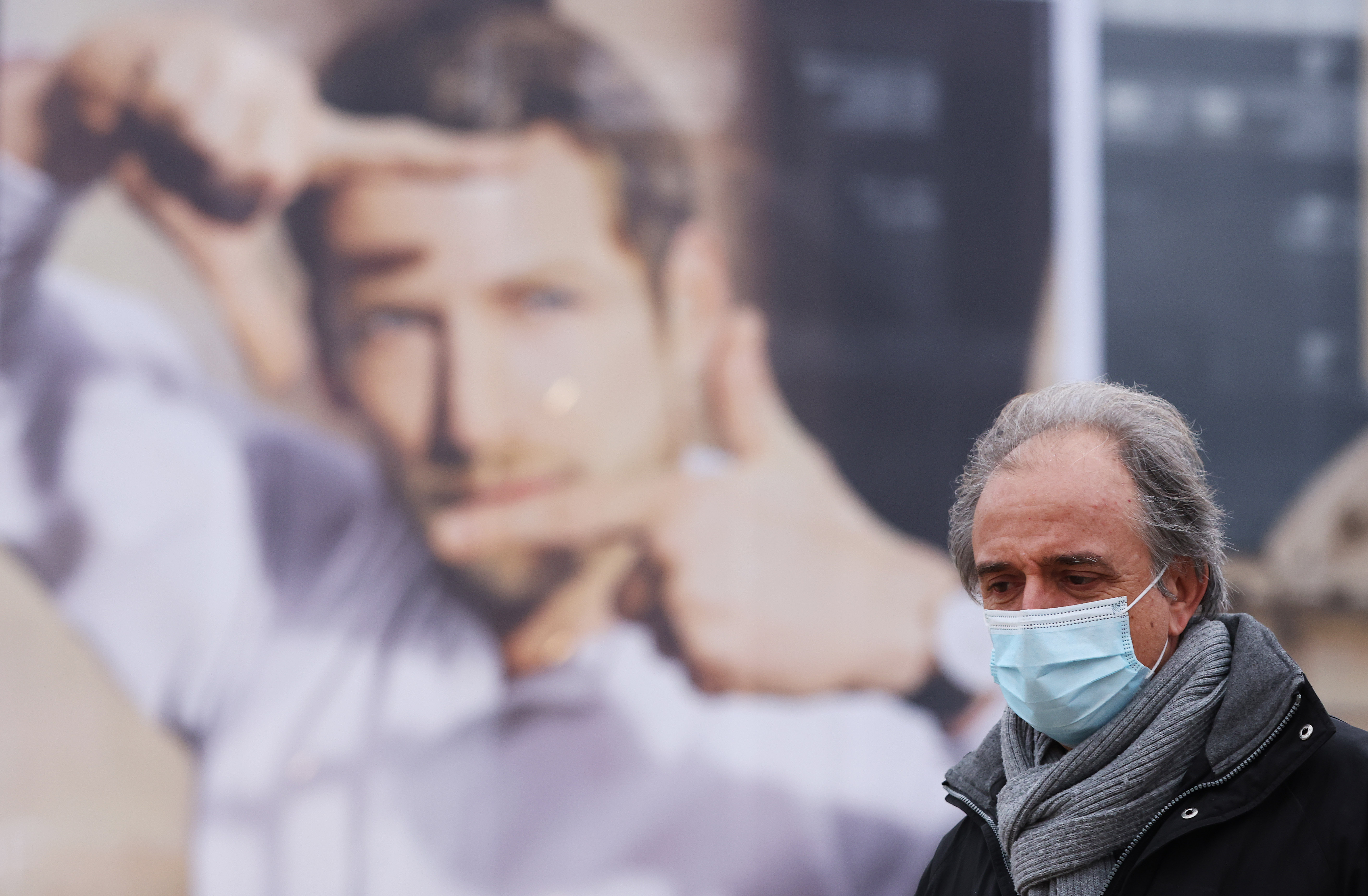 ▲2022年1月19日,一名男子从法国巴黎街头广告牌前走过。由于奥密克戎毒株迅速传播,法国政府发言人1月18日表示,法国仍处于严峻的疫情形势下。图/新华社