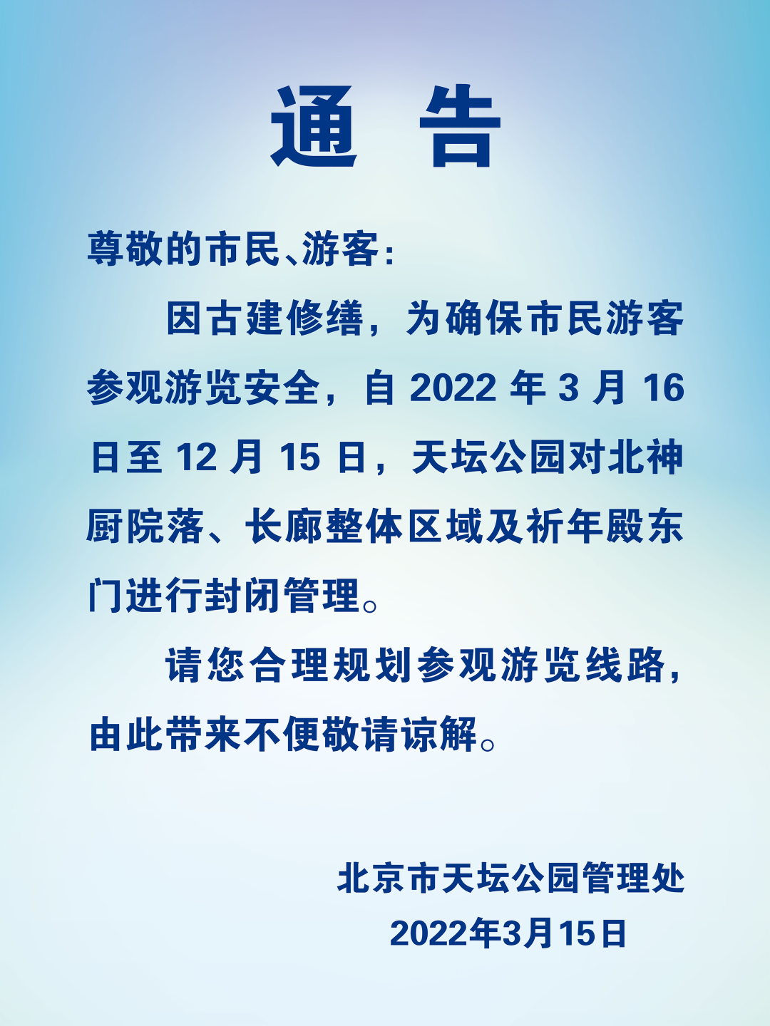 新京报快讯 3月15日,天坛公园发布通告,称因古建修缮,公园部分区域3月16日至12月15日进行封闭管理。