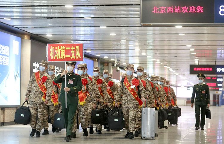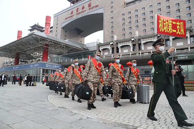 3月16日,随着G556次列车驶入北京西站,武警北京总队机动二支队迎来2022年首批春季入伍新兵,身着21式新军装的新兵有序下车、集合列队。今年,新兵训练将由三个月调整为五个月,训练课目也有所增加。经过新训阶段,他们将完成由地方青年向合格军人的转变。图为:G556次列车进站停车,首批来自湖北荆州的新兵走出车厢。