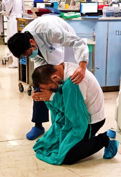 在十佳作品中,上海交通大学医学院附属仁济医院重症医学科医生杨润名为《双手》的作品,感动了很多人。照片里,跪地不起的男人,正在为病重的母亲祈祷,弓背弯腰的医生,用一双坚定而不失温柔的手搭在家属的肩膀上,希望他的安慰能给绝望的家属带来希望的曙光。