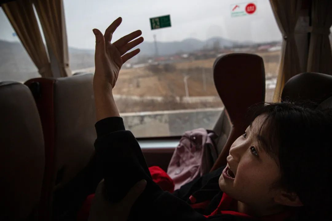 2022年2月12日,河北省保定市阜平县前往北京的车上,席庆茹举着手臂,练习邓老师教给她的小提琴指法。