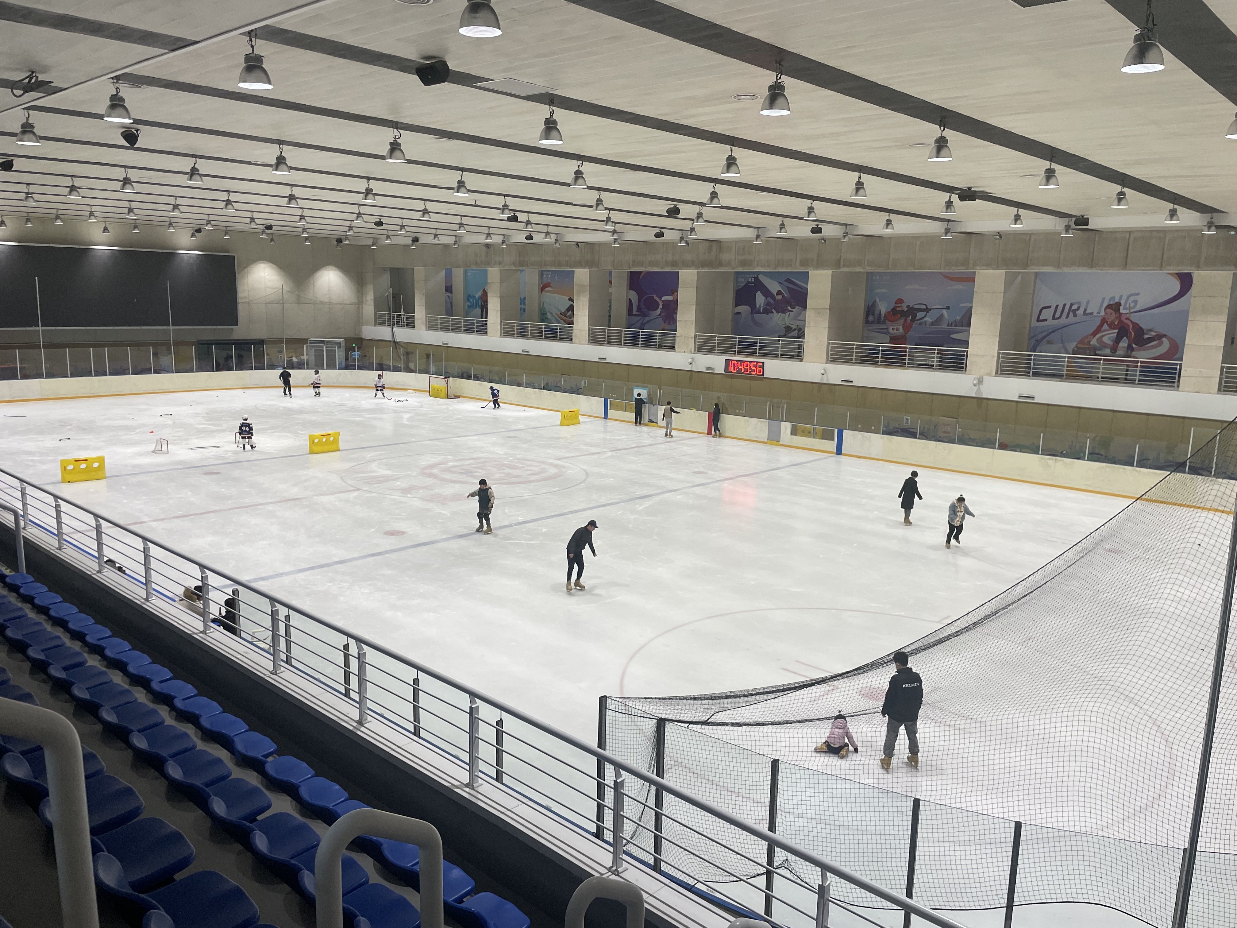 冰场也对外开放,有学花样滑冰的小姑娘,有全副武装手执冰球杆试探着滑行的冰球初学者,也有单纯享受冰上乐趣的市民。而每天早晚,冰球队雷打不动上冰训练一个多小时。