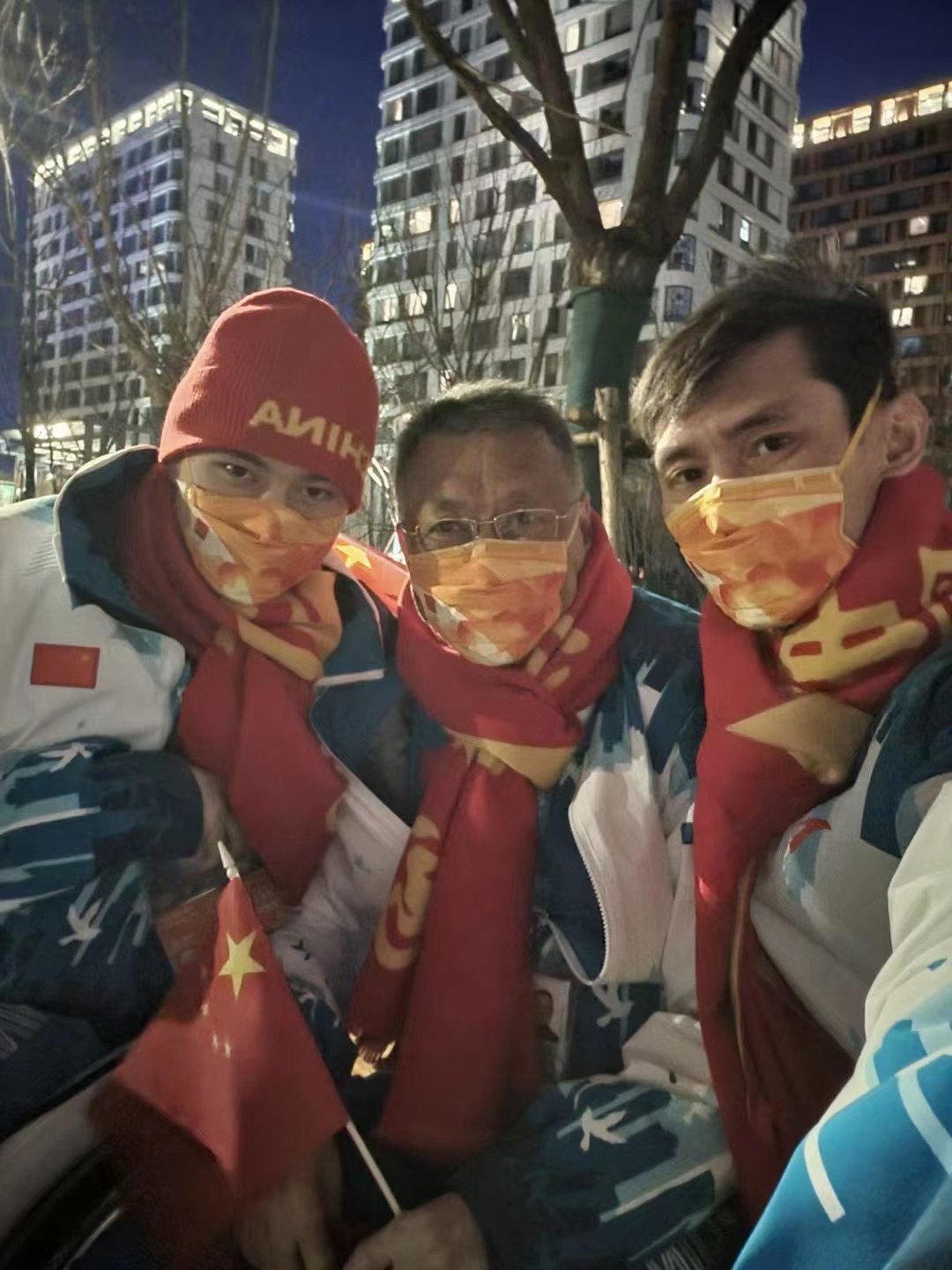 3月4日晚,北京冬残奥会开幕,照片中间为中国残奥冰球队副领队王建斌。受访者供图