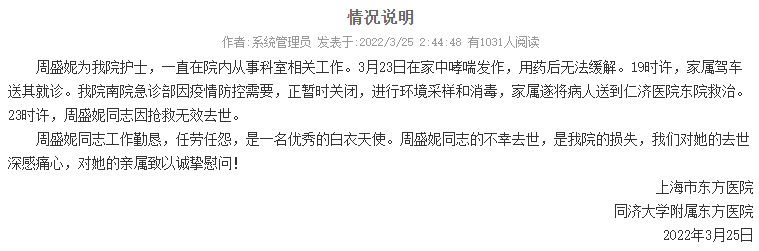 周盛妮为我院护士,一直在院内从事科室相关工作。3月23日在家中哮喘发作,用药后无法缓解。19时许,家属驾车送其就诊。我院南院急诊部因疫情防控需要,正暂时关闭,进行环境采样和消毒,家属遂将病人送到仁济医院东院救治。23时许,周盛妮同志因抢救无效去世。