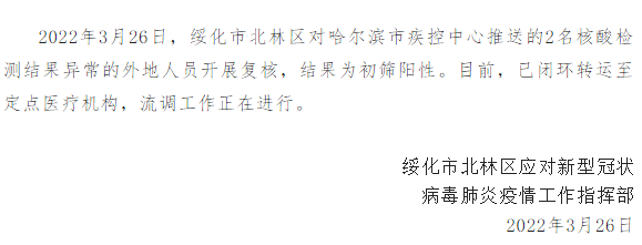 新京报快讯 据北林发布官微消息,2022年3月26日,绥化市北林区对哈尔滨市疾控中心推送的2名核酸检测结果异常的外地人员开展复核,结果为初筛阳性。目前,已闭环转运至定点医疗机构,流调工作正在进行。