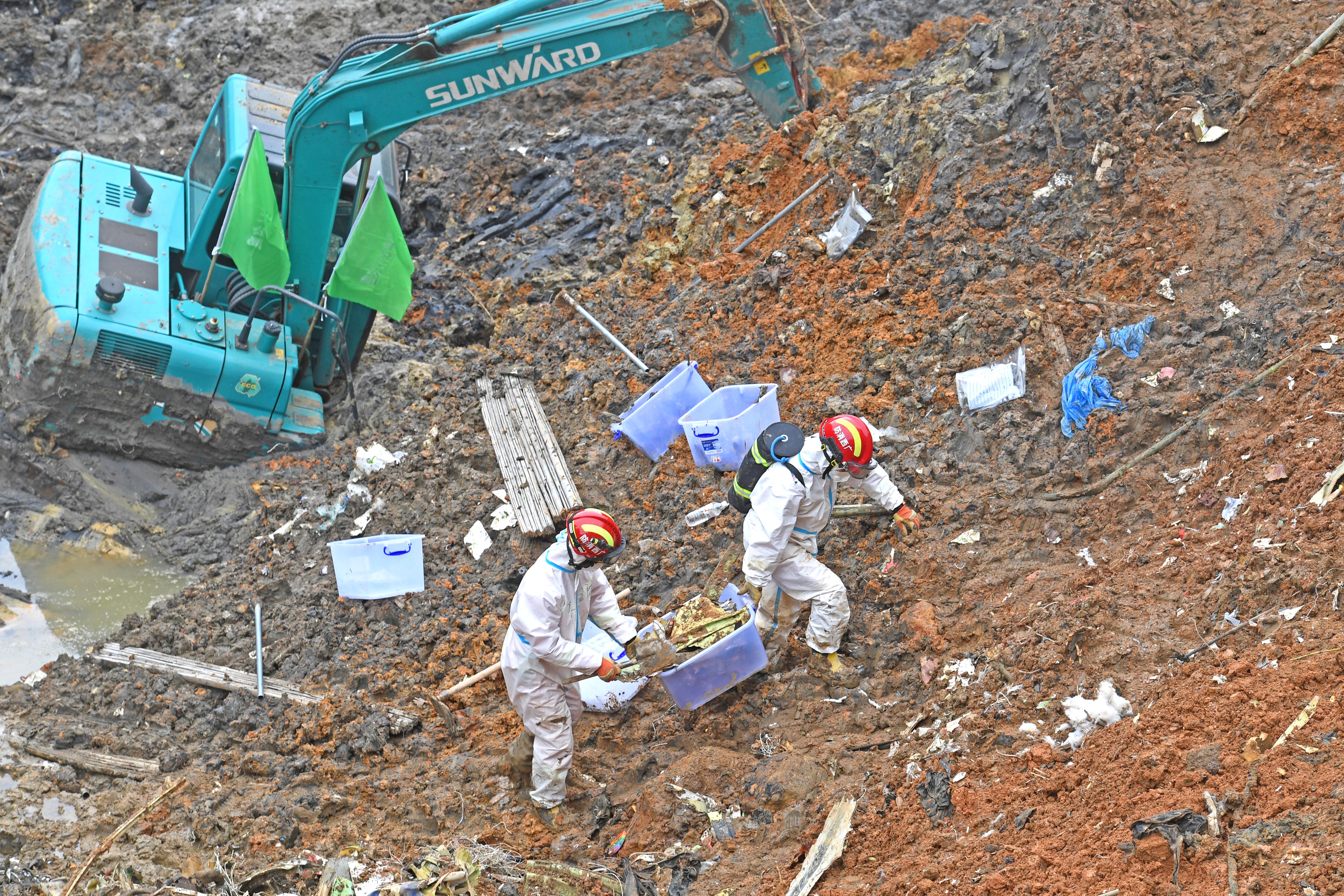 3月26日,搜救人员在事故核心现场清理歪倒的竹林。新华社记者 周华 摄