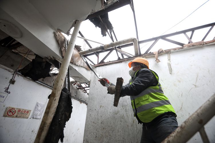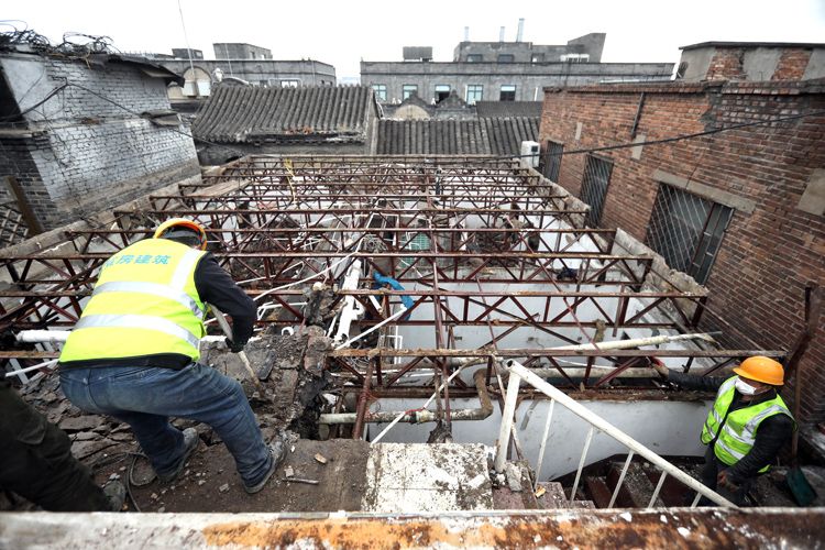 3月30日,粮食店街8号,工人拆除楼顶违建。粮食店街8号第三层为自建砖混结构建筑物,街道和相关责任人进行了约谈,责任人同意限期拆除该违法建设。