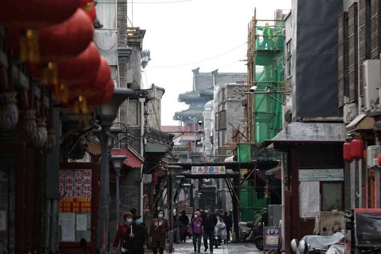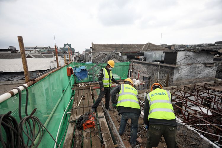 3月30日,北京西城区粮食店街8号外搭起脚手架,工人拆除违建。粮食店街8号位于大栅栏地区,在中轴线西侧。