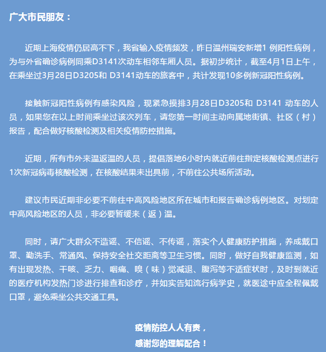 新京报快讯 4月1日,温州市疾病预防控制中心发布消息,乘坐过3月28日D3205和D3141动车的旅客,请立即报备。全文如下: