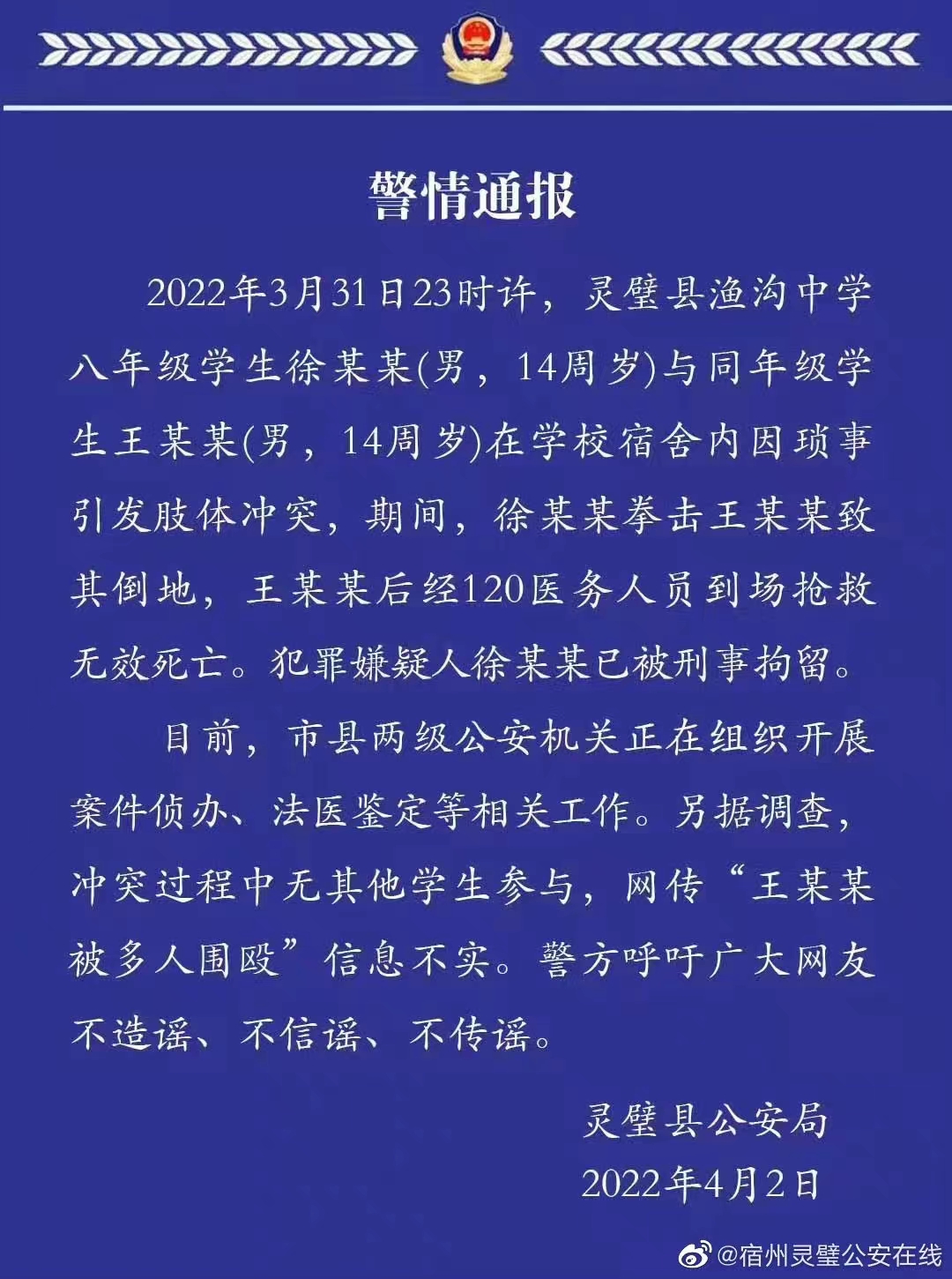 新京报快讯 4月2日,宿州灵璧公安通报灵璧14岁学生因冲突死亡一事。全文如下:
