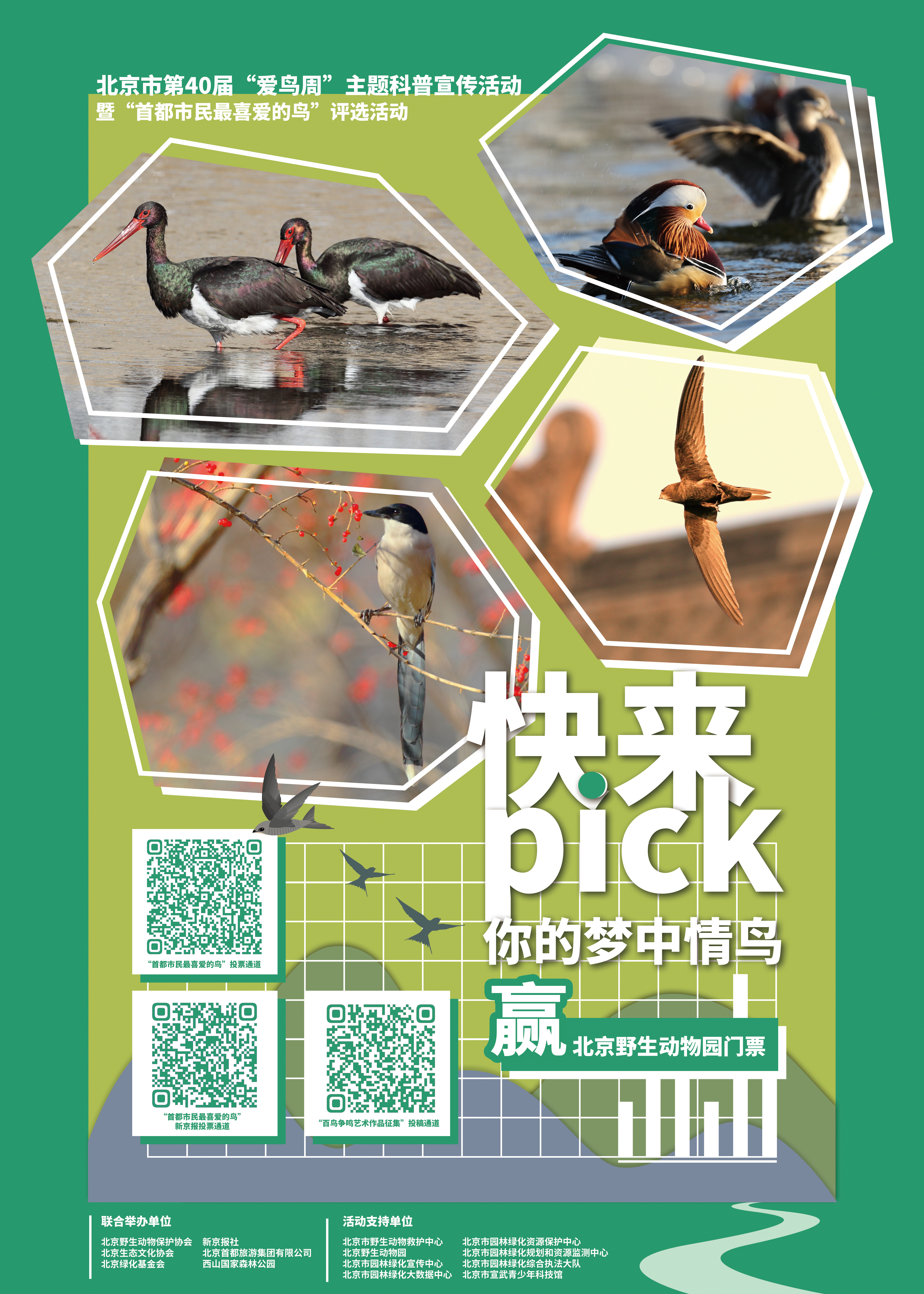 在4月的第三周我们迎来了北京市“爱鸟周”主题科普宣传活动暨“首都市民最喜爱的鸟”评选活动。本次活动以“守护蓝天精灵,共享美好家园”为主题,由北京野生动物保护协会、北京生态文化协会、北京绿化基金会、新京报联合举办,旨在贯彻落实习近平生态文明思想,推动生态文明理念融入全社会,传播爱鸟护鸟理念,了解市民喜爱的鸟种,为市鸟评选提供依据。