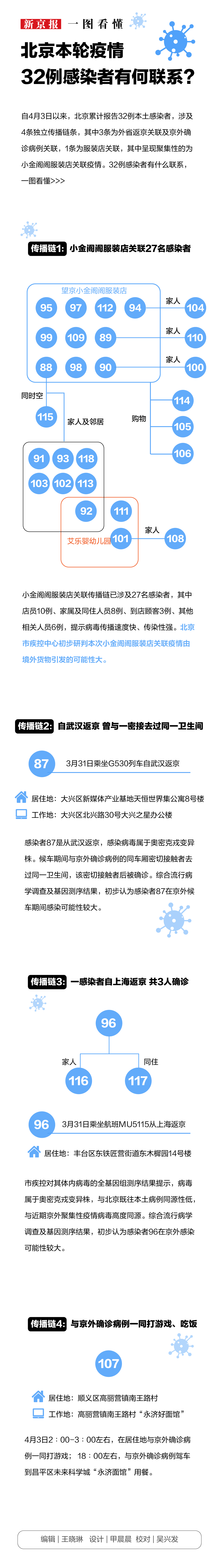 自4月3日以来,北京累计报告32例本土感染者,涉及4条独立传播链条,其中3条为外省返京关联及京外确诊病例关联,1条为服装店关联,其中呈现聚集性的为小金阁阁服装店关联疫情。32例感染者有什么联系,一图看懂↓↓↓