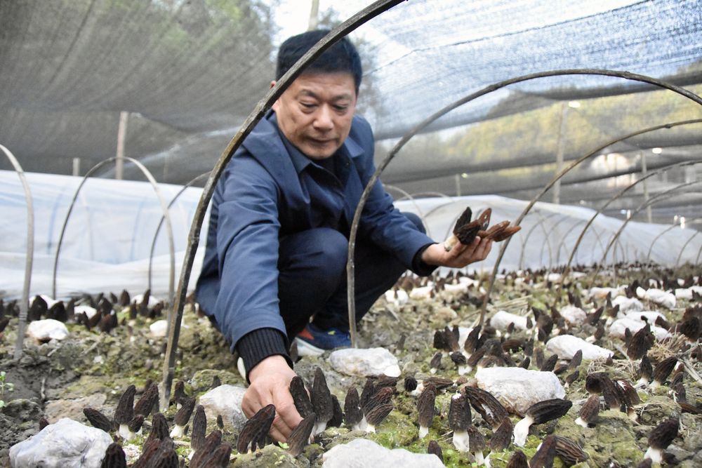 张分队正在检查今年在村上喜获丰收的羊肚菌。 新华社记者郑昕摄