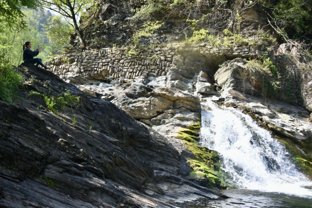 一名游人坐在汉水源村村口的瀑布旁观景。 新华社记者郑昕摄
