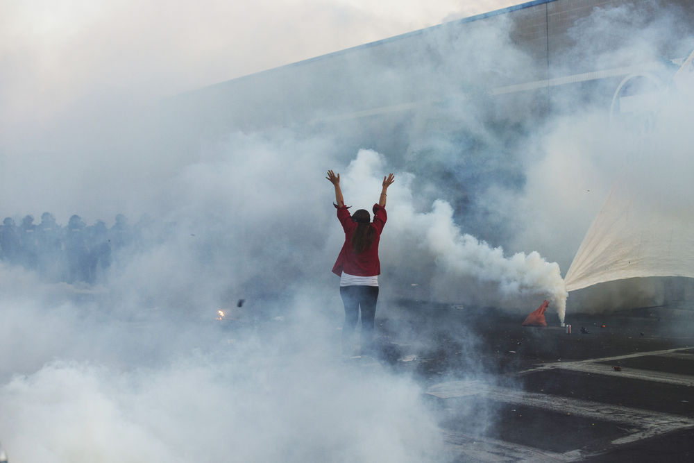 2020年5月30日晚,在美国明尼苏达州明尼阿波利斯市,一名示威者与警察对峙,抗议警方暴力执法致非洲裔男子乔治·弗洛伊德死亡。(新华社发,安格斯·亚历山大摄)