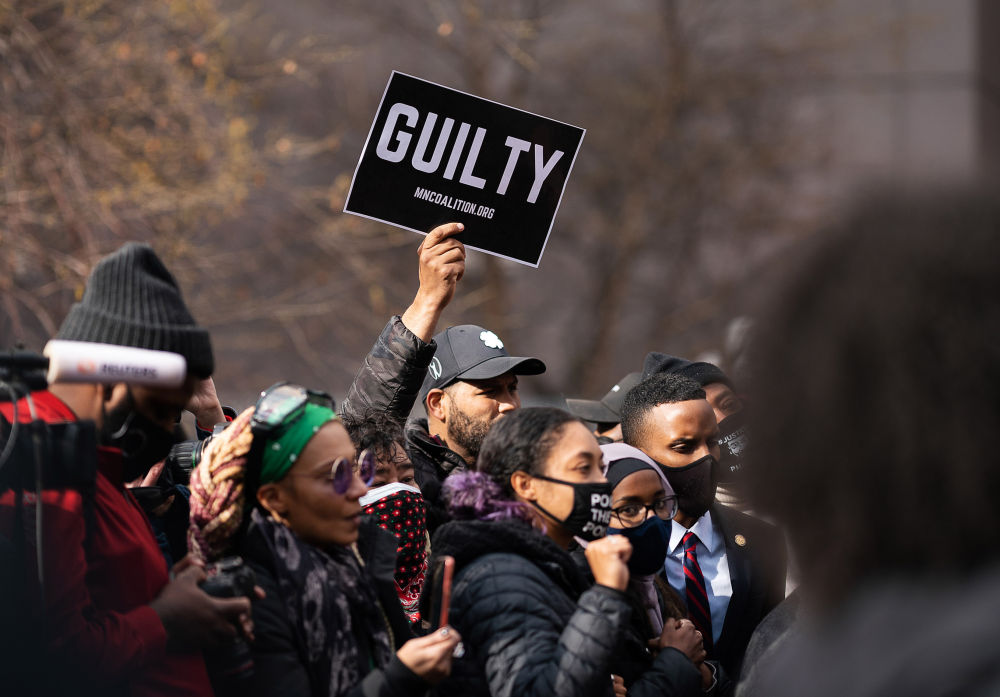 2021年4月20日,美国前白人警察德雷克·肖万被控杀害非洲裔男子乔治·弗洛伊德案在明尼苏达州明尼阿波利斯市宣判。图为民众手举“有罪”的标语聚集在法庭附近。(新华社发,本·布鲁尔摄)