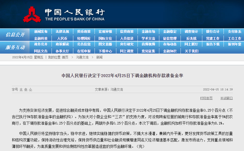 新京报讯 据中国人民银行网站消息,为支持实体经济发展,促进综合融资成本稳中有降,中国人民银行决定于2022年4月25日下调金融机构存款准备金率0.25个百分点(不含已执行5%存款准备金率的金融机构)。为加大对小微企业和“三农”的支持力度,对没有跨省经营的城商行和存款准备金率高于5%的农商行,在下调存款准备金率0.25个百分点的基础上,再额外多降0.25个百分点。本次下调后,金融机构加权平均存款准备金率为8.1%。