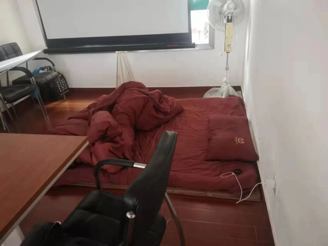 自崇明区封控后,张杰一直在办公室打地铺休息。受访者供图