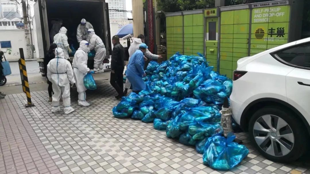 上海一小区的工作人员正在从运输车上卸货。受访者供图