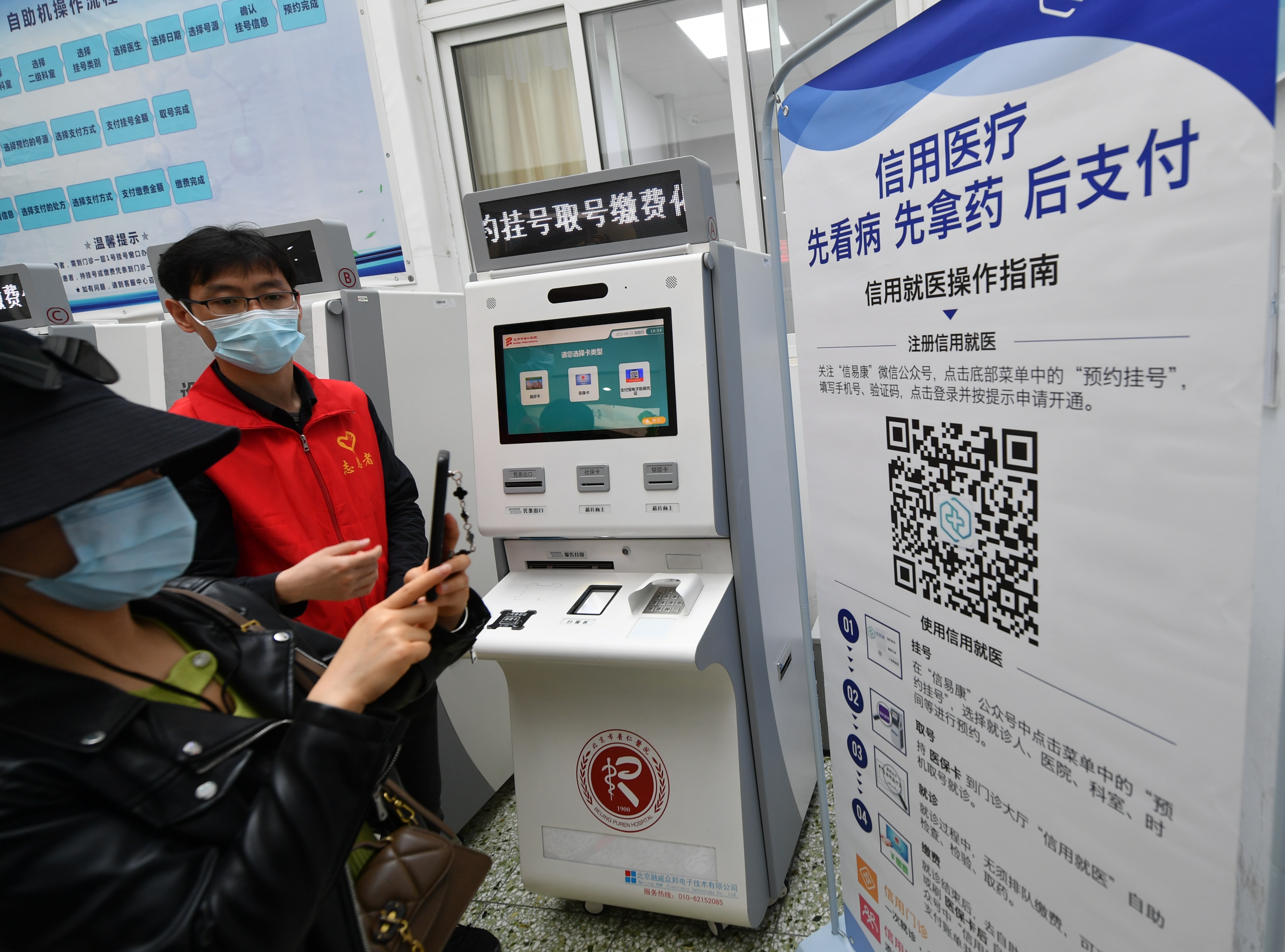 ▲4月21日,北京市东城区普仁医院门诊大厅里,志愿者指导居民进行信用医疗服务注册。 新京报记者 王贵彬 摄