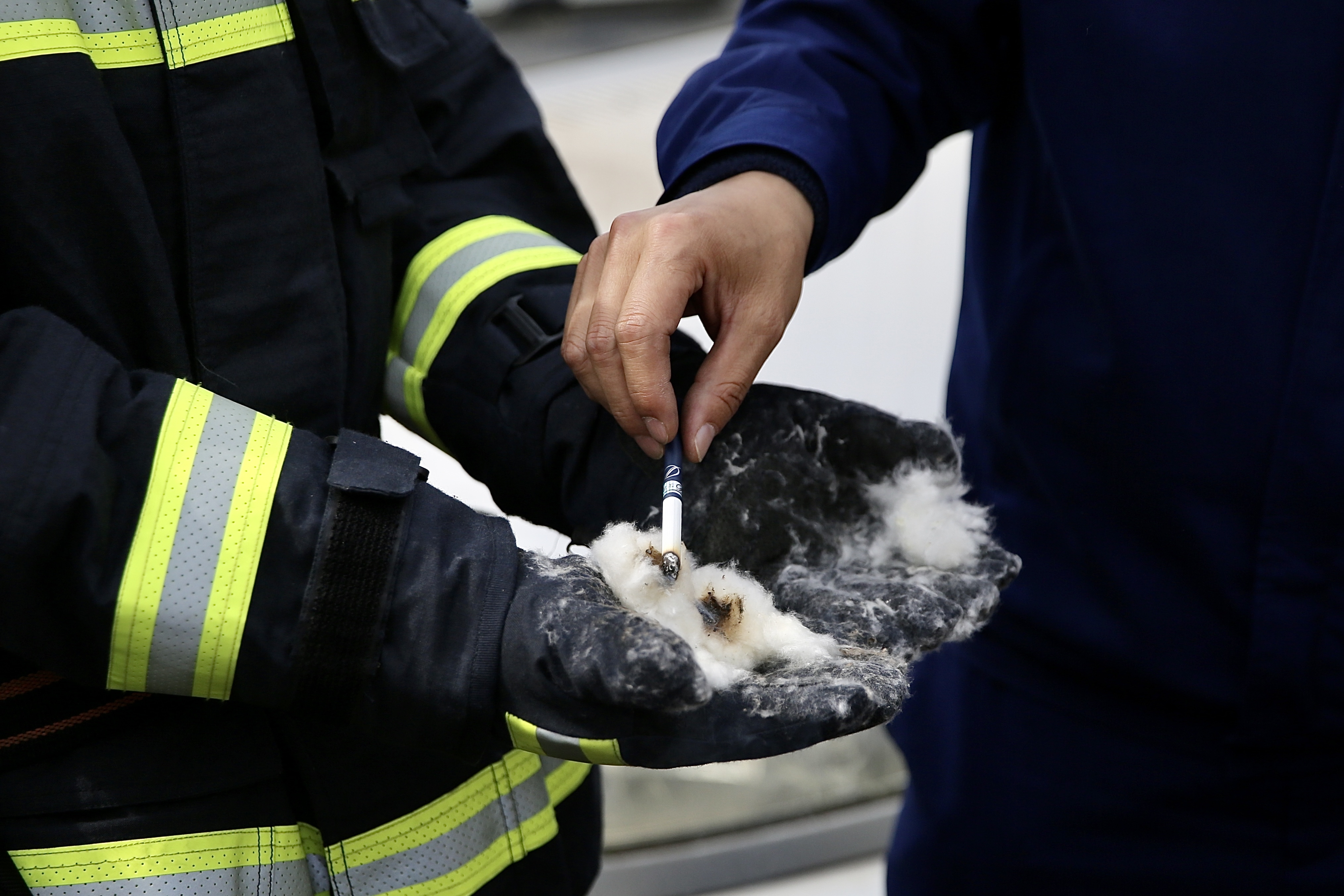 一名戴着防护手套的消防员率先演示了杨柳絮遇到明火的反应。新京报记者在现场看到,杨柳絮一碰到明火便迅速燃烧,并以极快的速度蔓延。随后,消防员又将一个未掐灭的烟头放在一团杨柳絮中,烟头周围的杨柳絮迅速变黑碳化,并有微小火星产生,不一会儿,杨柳絮便燃烧起来。