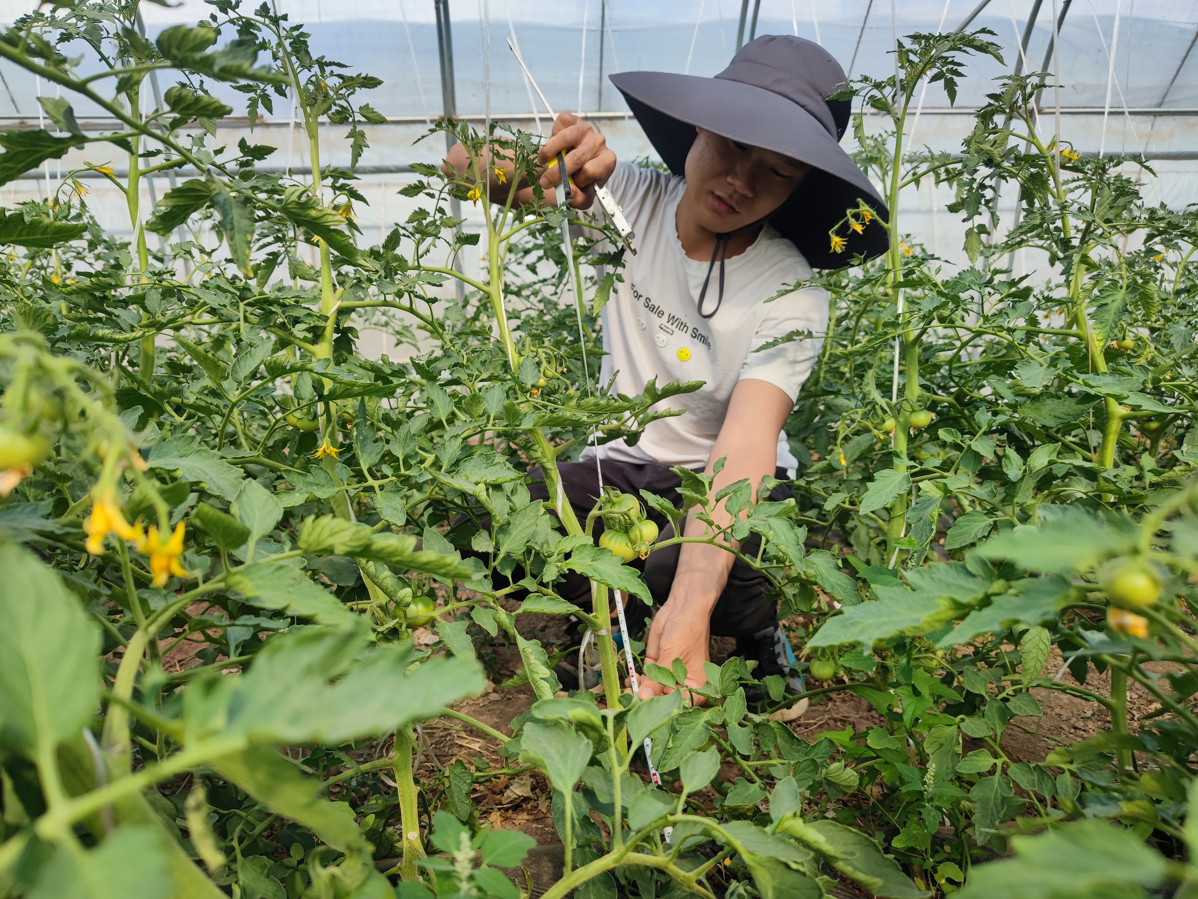 2021年5月18日,宁国法在设施大棚内测量番茄植株高度,记录实验数据。受访者供图