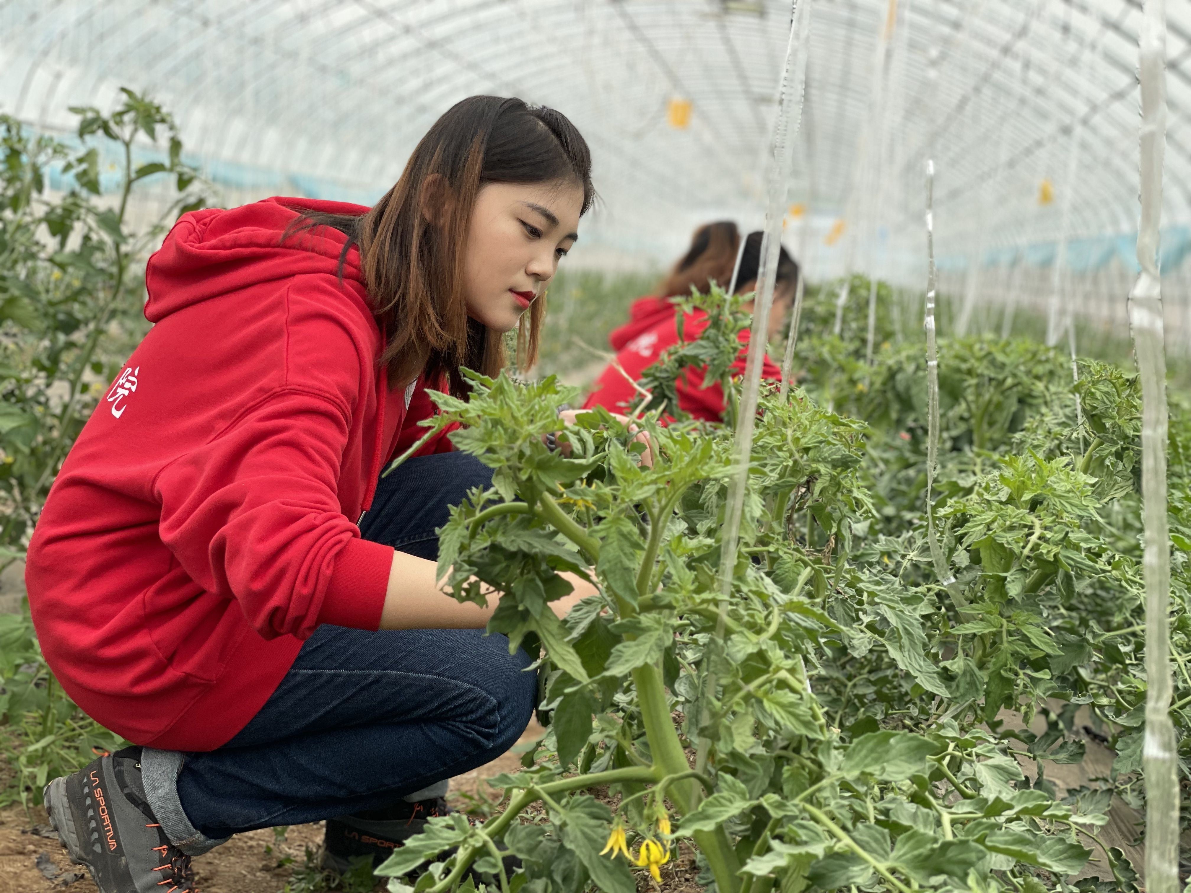 4月21日,农大研究生吴林静和伙伴们在设施大棚中为番茄掰茬。新京报记者 田杰雄 摄