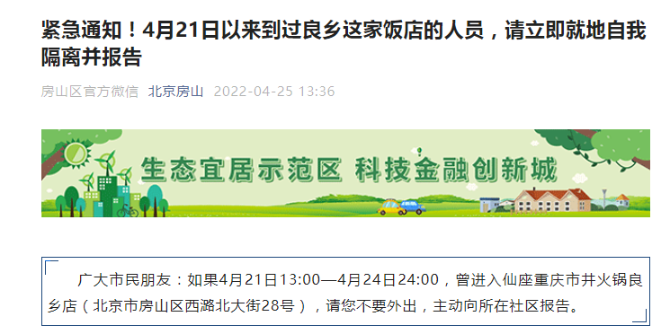 新京报讯 据北京房山官微消息,如果4月21日13:00—4月24日24:00,曾进入仙座重庆市井火锅良乡店(北京市房山区西潞北大街28号),请您不要外出,主动向所在社区报告。