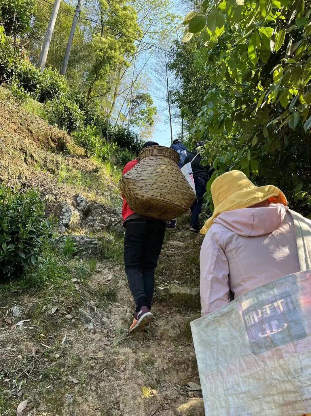 2022年4月11日,陈双伟和结伴而来的导游背着背篓去山上采茶。受访者供图