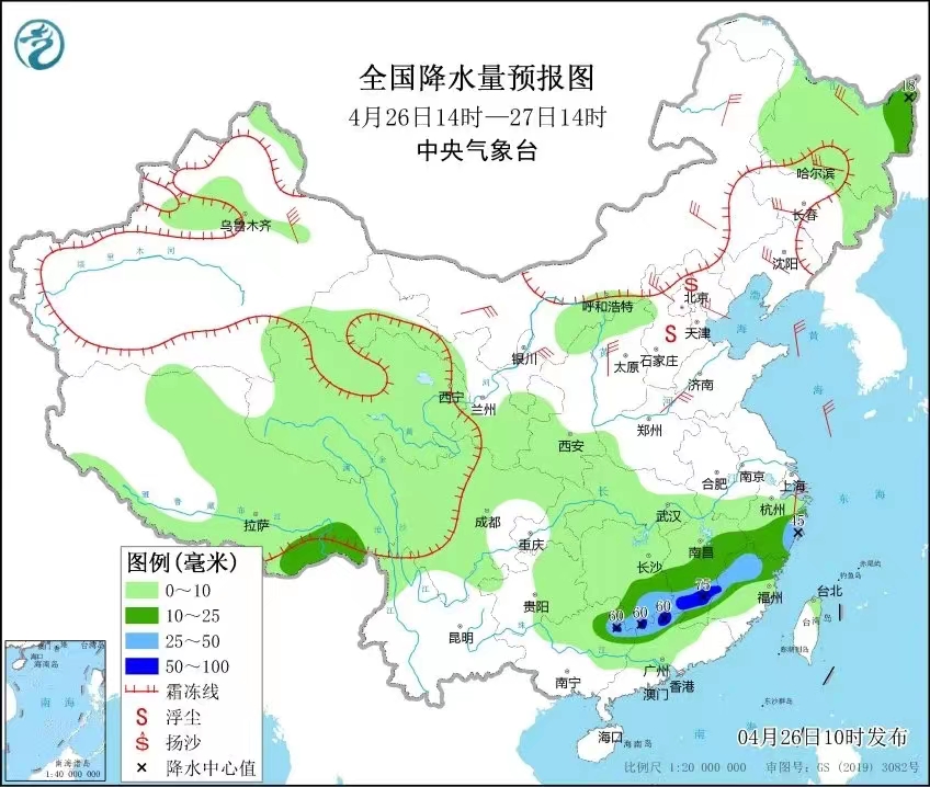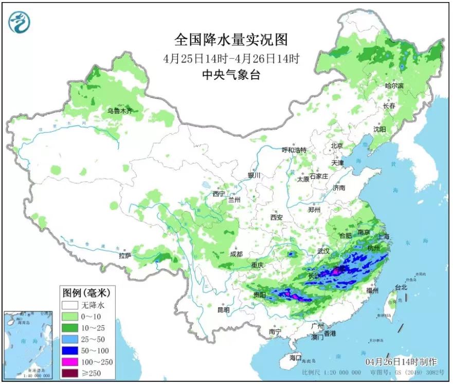 4月25日14时-26日14时,全国降水量实况图。图源中央气象台