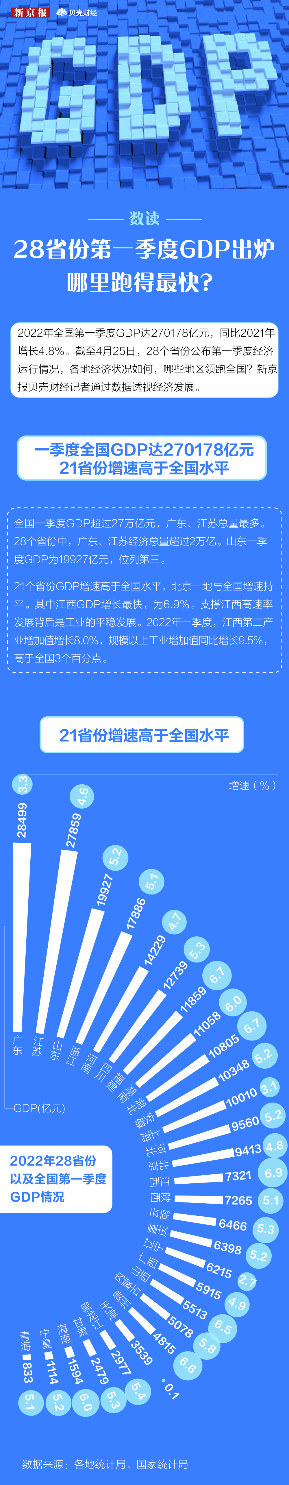 2022年全国第一季度GDP达270178亿元,同比2021年增长4.8%。截至4月25日,28个省份公布第一季度经济运行情况,各地经济状况如何,哪些地区领跑全国?新京报贝壳财经记者通过数据透视经济发展。