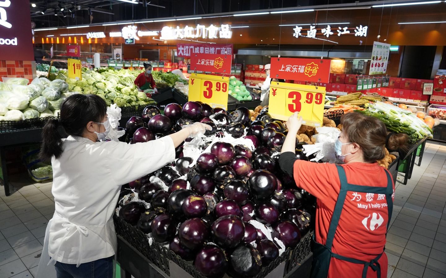 4月26日,家乐福超市双井店备货充足,工作人员正在将蔬菜一一摆上货架。 新京报记者 王飞 摄