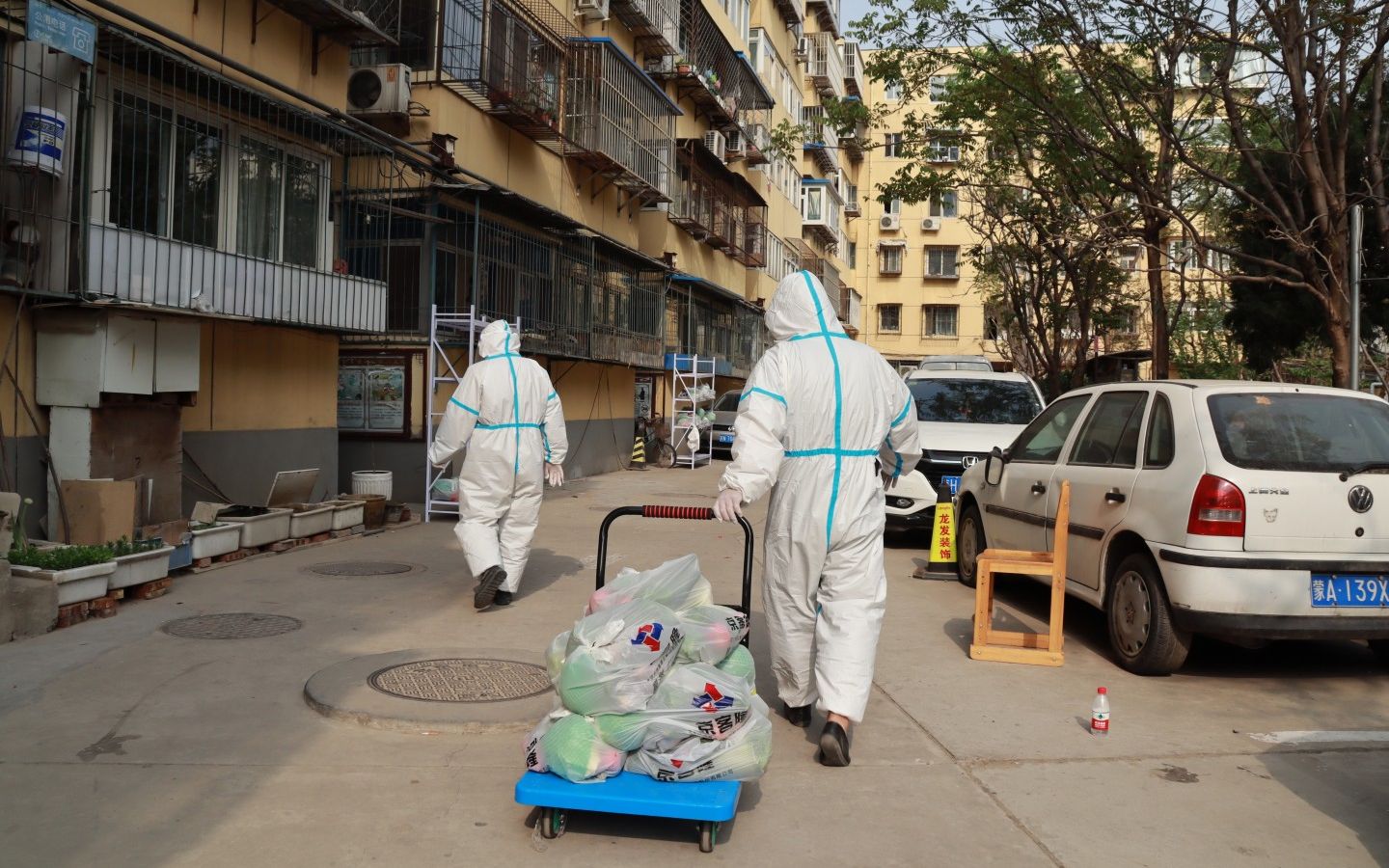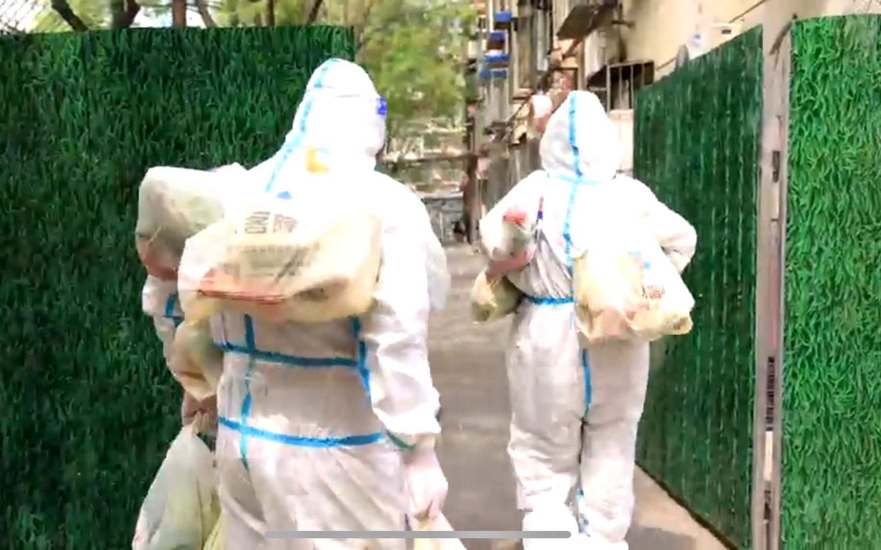 4月26日下午,劲松街道封控小区内,身穿防护服的“大白”从货物暂存架上将一包包蔬菜包挂在自己身上,“我这挂了四袋,你挂了多少?”两位“大白”在“比试”谁一次性拿的蔬菜包更多,只见他们身上挂着、手里拎着,有的干脆用一个大收纳箱摆放进好多袋蔬菜,把收纳箱扛在肩上走。小区封控以来,想把居民的蔬菜更快一些送上去。