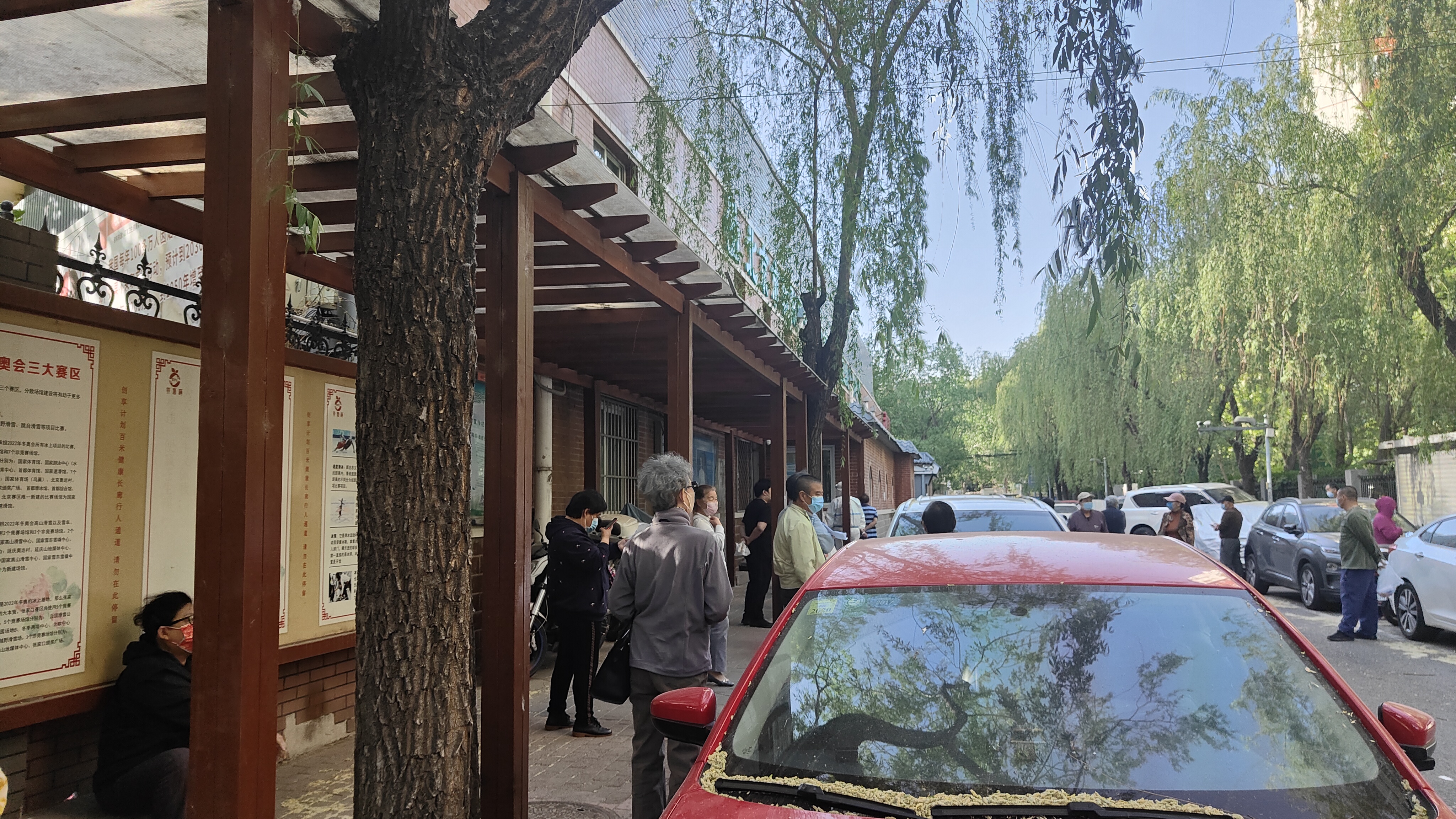 4月26日16时许,松榆里社区内的潘家园第二社区卫生服务中心,多位居民在门口等待取药。新京报记者 刘瑞明 摄