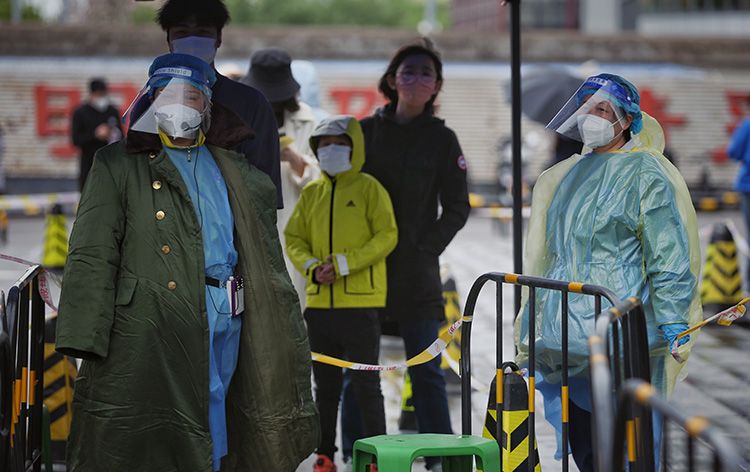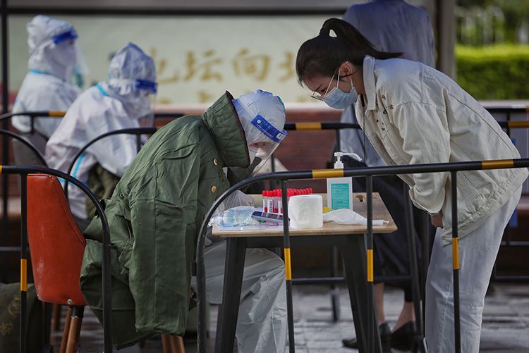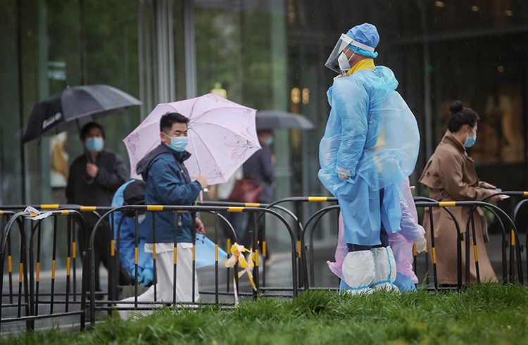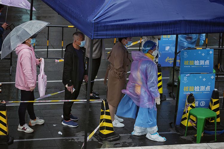 4月27日,北京市朝阳区迎来第二次扩大范围核酸检测,社区、商业写字楼、地铁口、户外广场等场所搭起临时核酸检测采样点,方便居民就近核酸采样。蒙蒙细雨中,“大白”坚守岗位,为每一位居民提供服务。图为:十里堡万科时代中心核酸检测点,阵风吹起工作人员的雨衣。