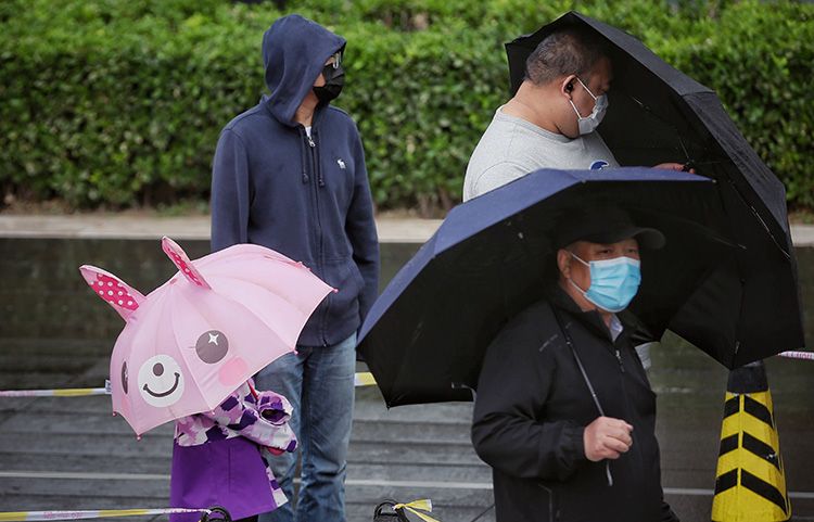十里堡万科时代中心核酸检测点,一位小女孩撑着卡通伞排队等待核酸采样。