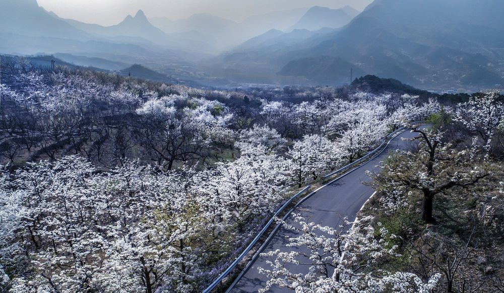 镇罗营镇梨花大道盛装迎客,万亩梨花进入最佳赏花期。远远望去,漫山遍野的梨花,把大地装扮得像一座座连绵起伏的雪山。王焱 摄