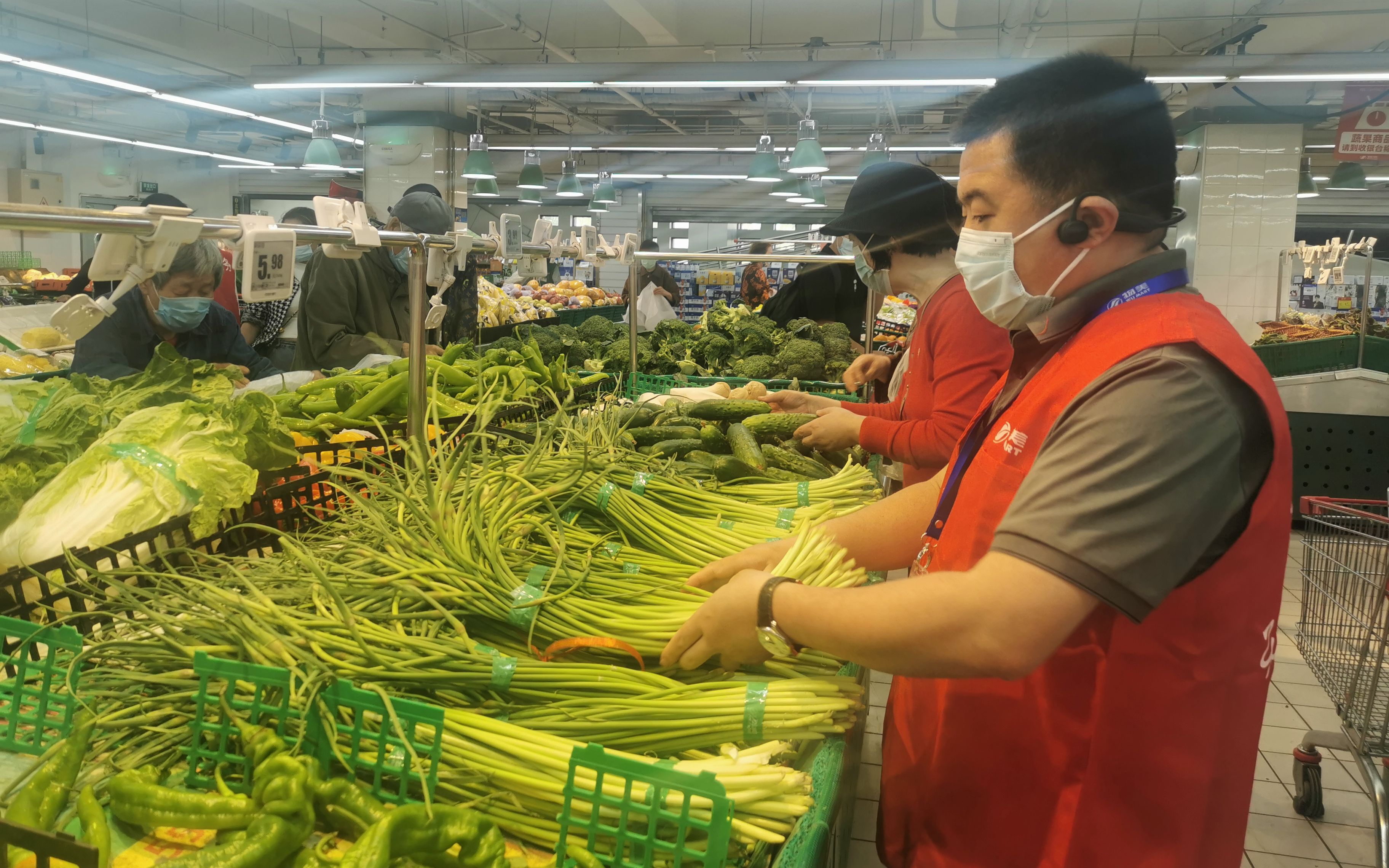 店长王永震正在超市整理蔬菜。受访者供图